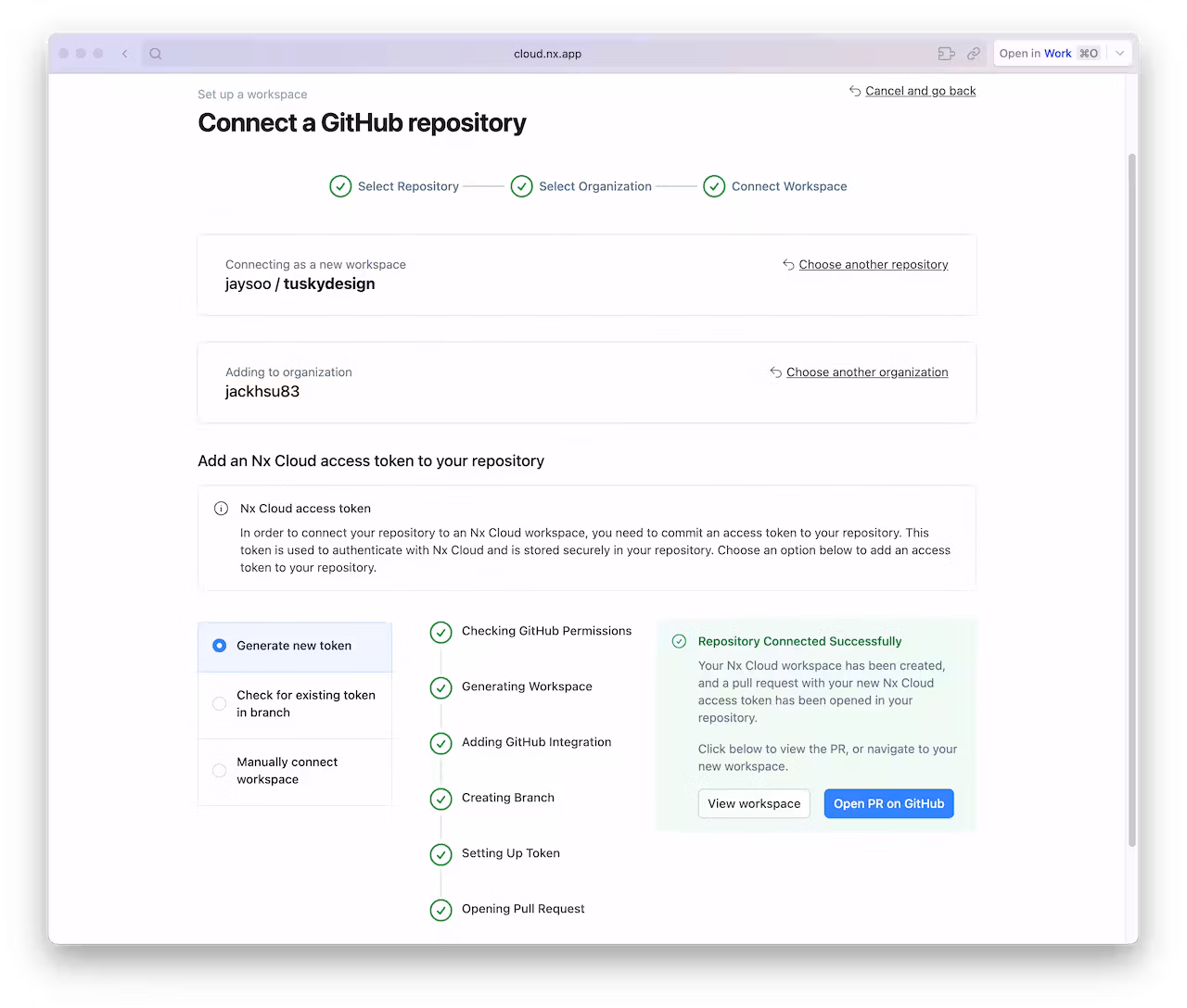 A browser window will open to register your repository in your Nx Cloud account. The link is also printed to the terminal if the windows does not open, or you closed it before finishing the steps. The app will guide you to create a PR to enable Nx Cloud on your repository.